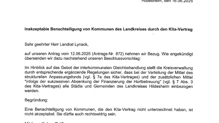 Inakzeptable Benachteiligung Kommunen KitaVertrag
