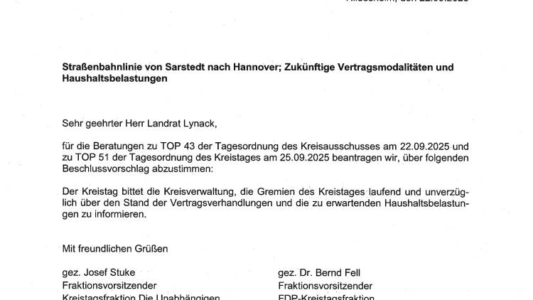 Antrag 933 Straßenbahnlinie von Sarstedt nach Hannover — Zukünftige Vertragmodalitäten und HHBelastung 22.09.2025